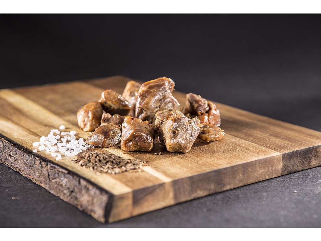 Tak to je opravdu maso! Ručně očištěné a porcované kousky vepřové plece pečené v páře spolu s kmínem. Díky vyššímu obsahu tuku je maso hezky šťavnaté, chutné a ani potom co ztratí pečením třetinu své váhy není vysušené. Malá hmotnost a vysoká výživová hodnota předurčuje použití masa i v případě, že cestujete na lehko.