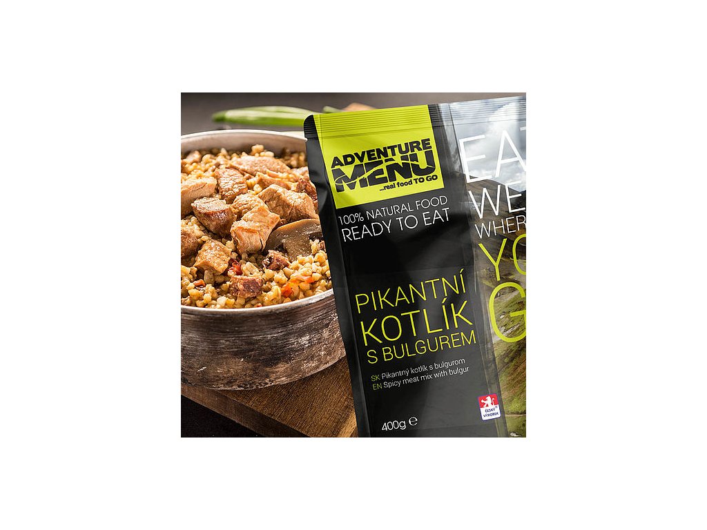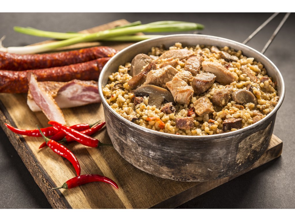 Vepřová kýta a krutí stehenní maso se spojí v jednom jídle s omáčkou s proužky cibule, masitou klobásou, špekem a žampiony. S bulgurem, který je vlastně celozrná nalámaná pšenice tvoří velice výživné jídlo s příjemným šmrncem díky feferonkám a chilli.