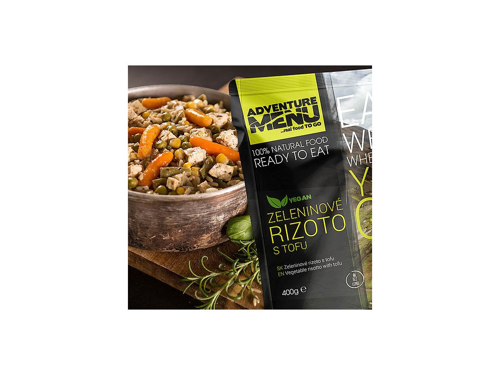 Nová lahůdka od Adventure Menu je určena speciálně pro vegany! Zeleninové rizoto s tofu si ale dozajista zamilují všichni. Nová rýže typu parboiled skvěle drží tvar a vyniká skvělou úpravou „al dente“. S výběrovou zeleninou jako je baby karotka, hrášek, zelené fazolky a kukuřice je to správný základ pro skvělé rizoto. Výraznou chuť však jídlu dodává vyvážená směs provensálských bylinek. Pro ještě vyšší výživovou hodnotu a dokreslení skvělé chuti jsme do rizota přidali na kostičky nakrájené přírodní nigari tofu. Zeleninové rizoto s tofu vám zajistí příjemný zážitek z jídla i energii na celý den.