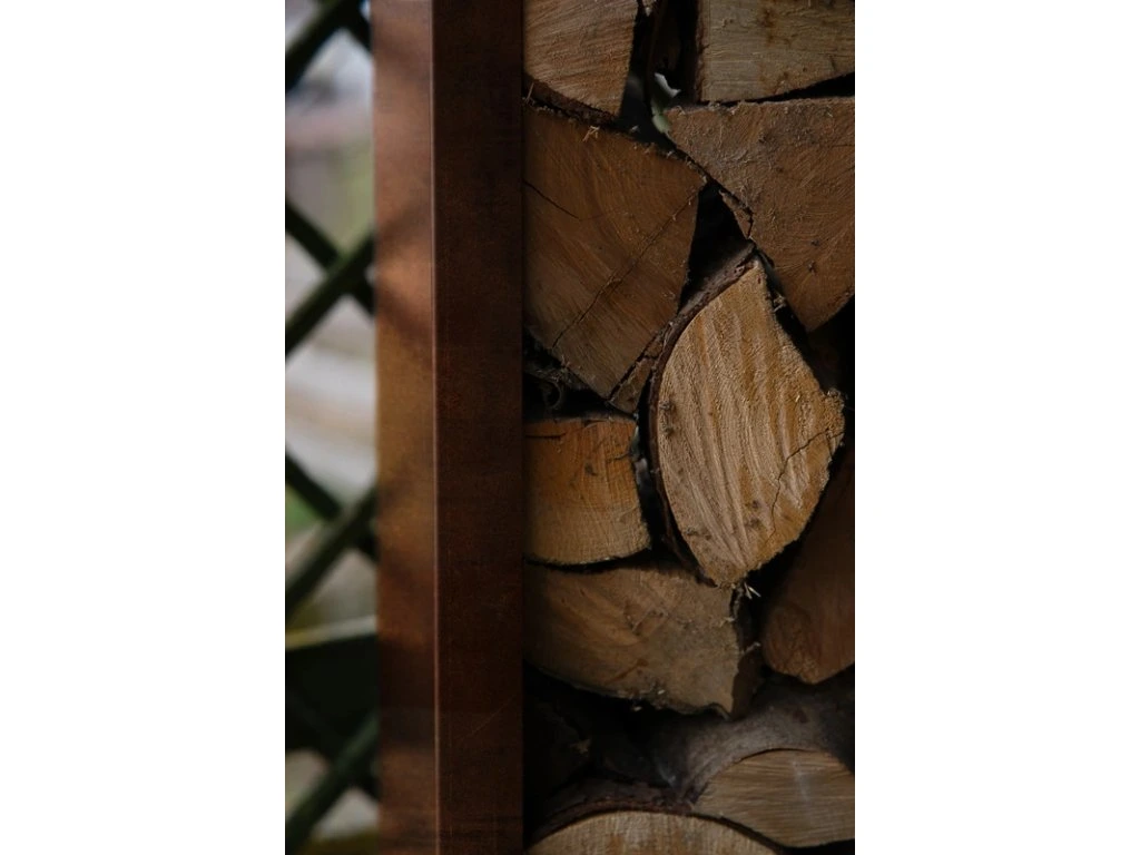 COR-TEN® ocel se v průběhu času mění – její povrch získává charakteristickou rezavou patinu, která působí přirozeně, chrání materiál před korozí a dodává dřevníku jedinečný vzhled, jenž s věkem zraje.