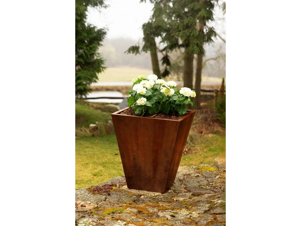 Zahradní květináč CONO je výsledkem precizní české výroby a promyšleného designu. Využívá originální švédskou ocel COR-TEN®, která v exteriéru přirozeně patinuje – bez nutnosti nátěrů nebo další údržby. Charakteristická rezavá vrstva není vadou, ale funkční ochranou, která zajišťuje dlouhou životnost i odolnost vůči dešti, mrazu a slunečnímu záření.
